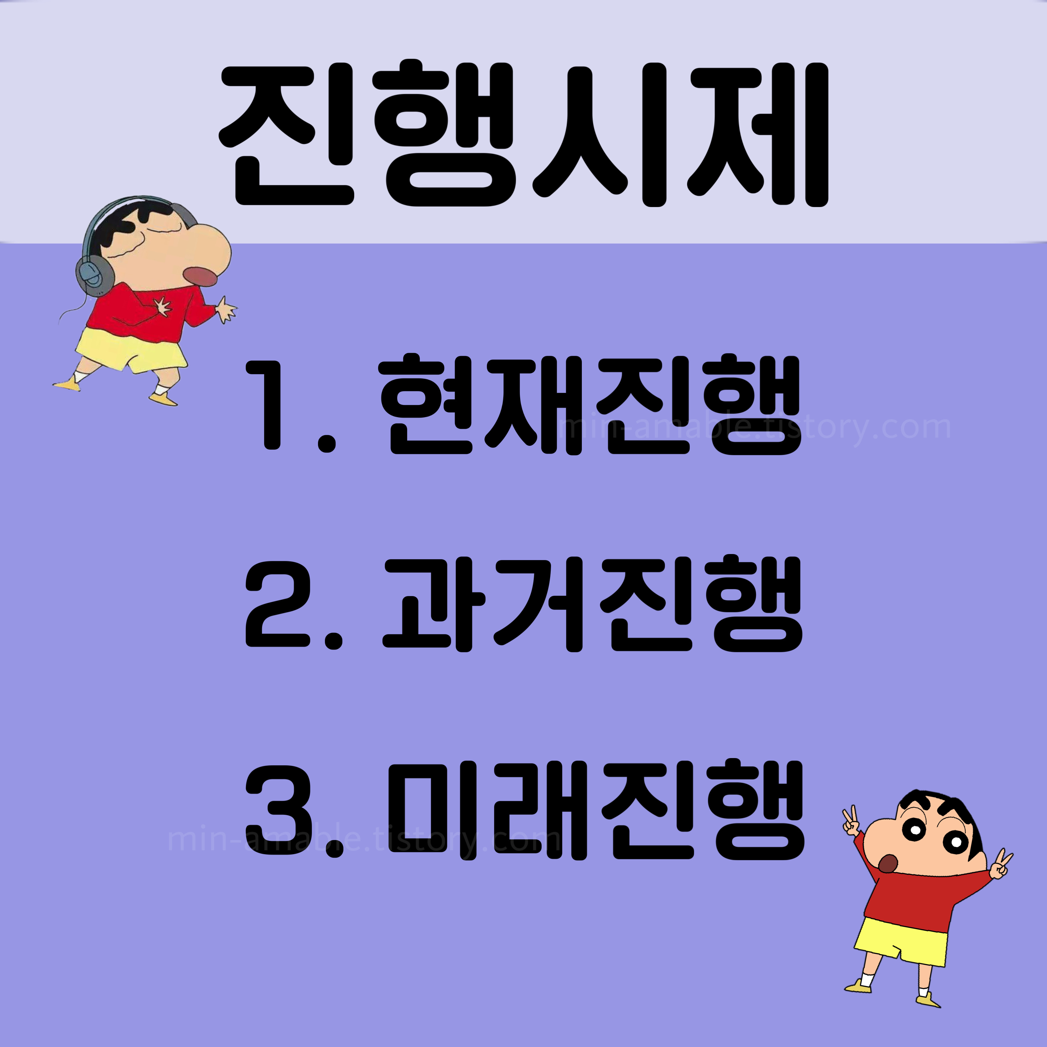진행시제는 특정한 시점에 진행 중인 일을 나나태며, 진행시제에는 현재진행, 과거진행, 미래진행 - 3가지 종류가 있습니다.