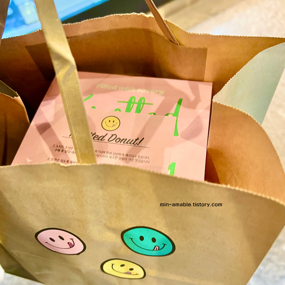 도넛 진열장 쪽에 카페 노티드의 시그니처 캐릭터 스티커(?)가 있어서 종이봉투에 붙여 보았어요 :)