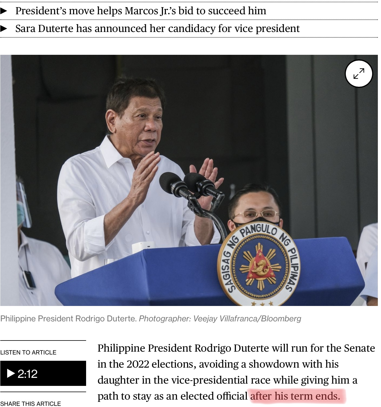 Philippine President Rodrigo Duterte will run for the Senate in the 2022 elections, avoiding a showdown with his daughter in the vice-presidential race while giving him a path to stay as an elected official after his term ends.