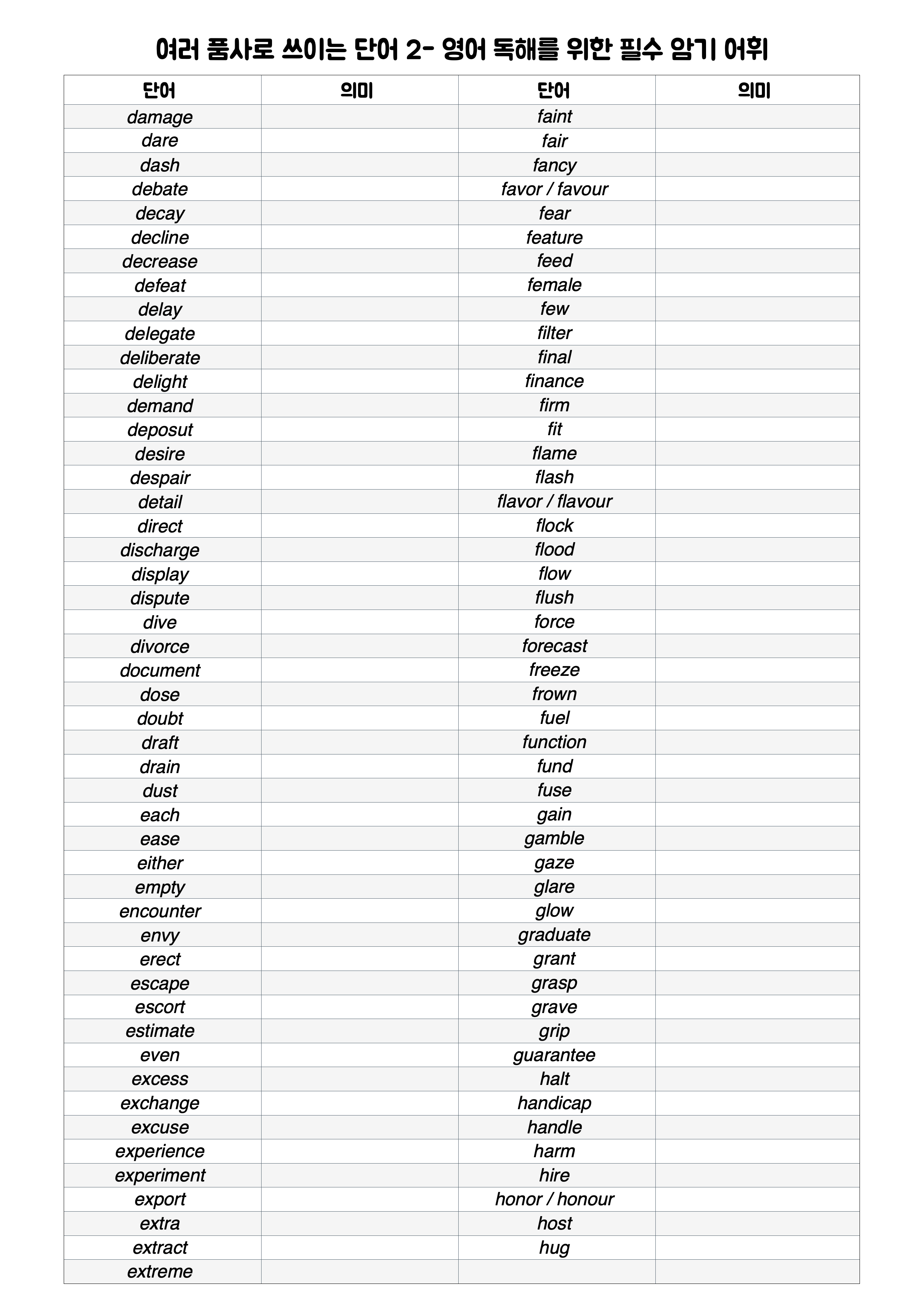 오늘 포스팅에서는 여러 품사로 쓰이는 영어단어 2 - 영어 독해를 위한 필수 암기 어휘를 정리해 보겠습니다. 지난번 여러 품사로 쓰이는 영어 단어 1에서 처럼 포스팅 하단에 뜻 지운 표 업로드할게요. PDF 파일도 올려놓을 테니 다운로드 한 뒤에 단어장으로 꼭 활용해 보시길 바랍니다. 아는 단어 위주가 아닌, 모르는 단어 위주로 암기하셔야 합니다.