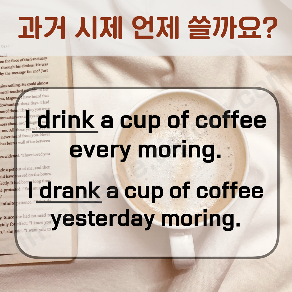 현재 시제 문장은 매일 아침마다 커피를 마신다는 규칙적인 습관, 반복적인 행동에 대해 말해주는 반면, 과거 시제는 어제 아침에 커피를 마셨다는, 지나간 시간에 대해서 했던 일을 이야기해주고 있습니다.