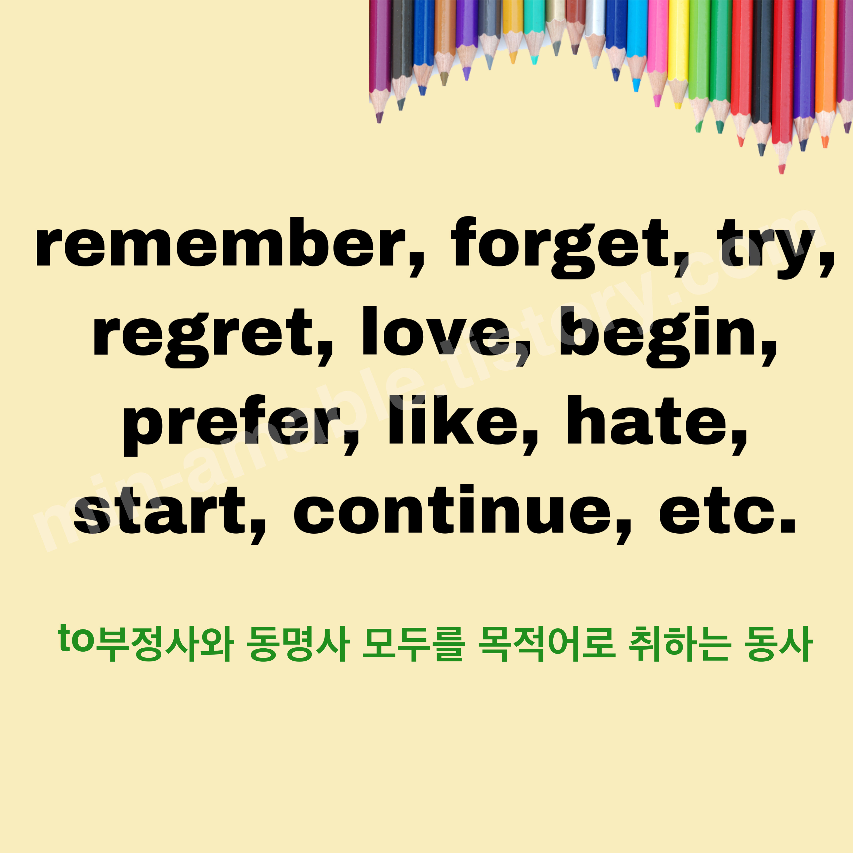 지난번 to부정사를 목적어로 취하는 동사, 동명사를 목적어로 취하는 동사를 배웠습니다. 아직까지 외우고 있지 못한다면, 학교 내신 대비 영어공부를 잘 못하고 있는 거예요. to부정사, 동명사