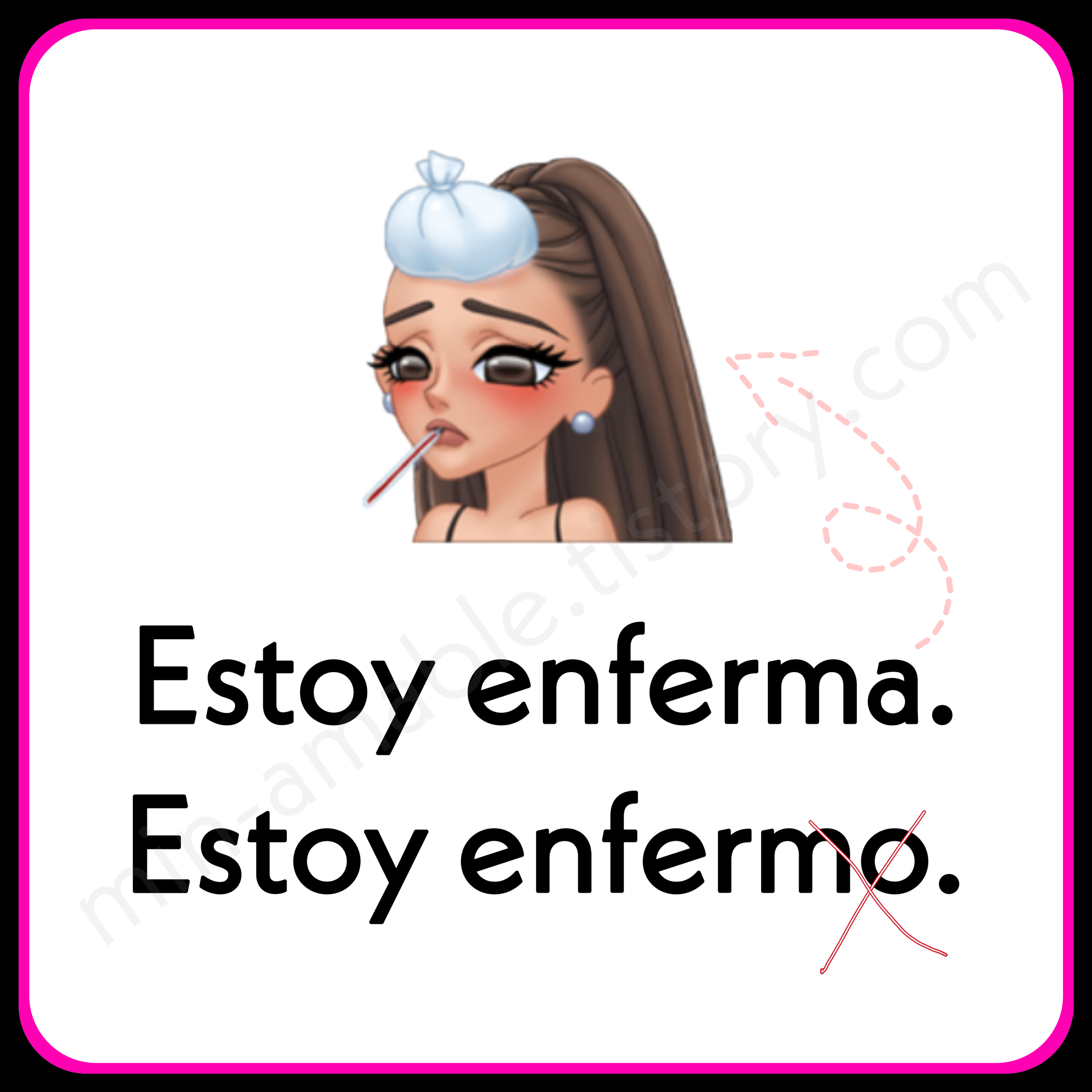 | (Yo) Estoy enferma. | 나는 아프다 | (Yo) Estoy enfermo. | 나는 아프다 |