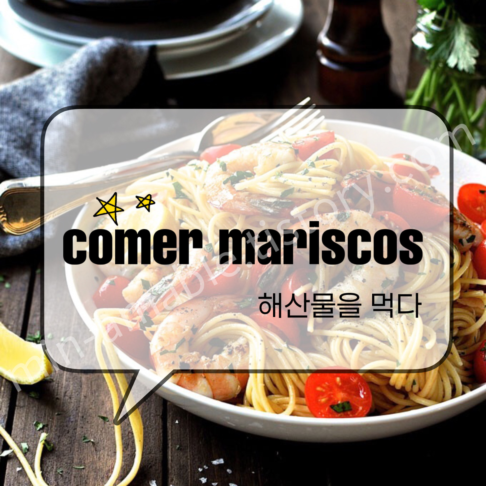 <Comer mariscos. - 해산물을 먹다.> 입니다. 주어에 따라 comer 동사 형태가 바뀌어야 겠죠?