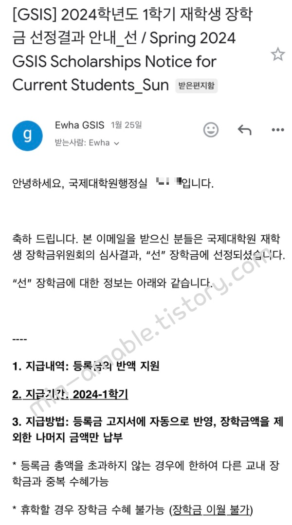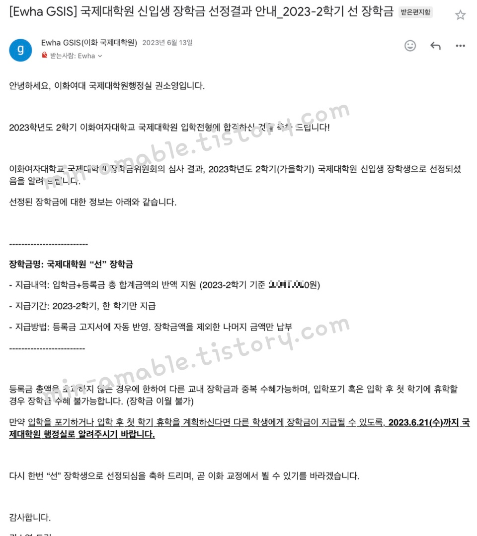 합격자 발표가 난 뒤에 이화여자대학교 국제대학원행정실에서 메일이 날라 옵니다.