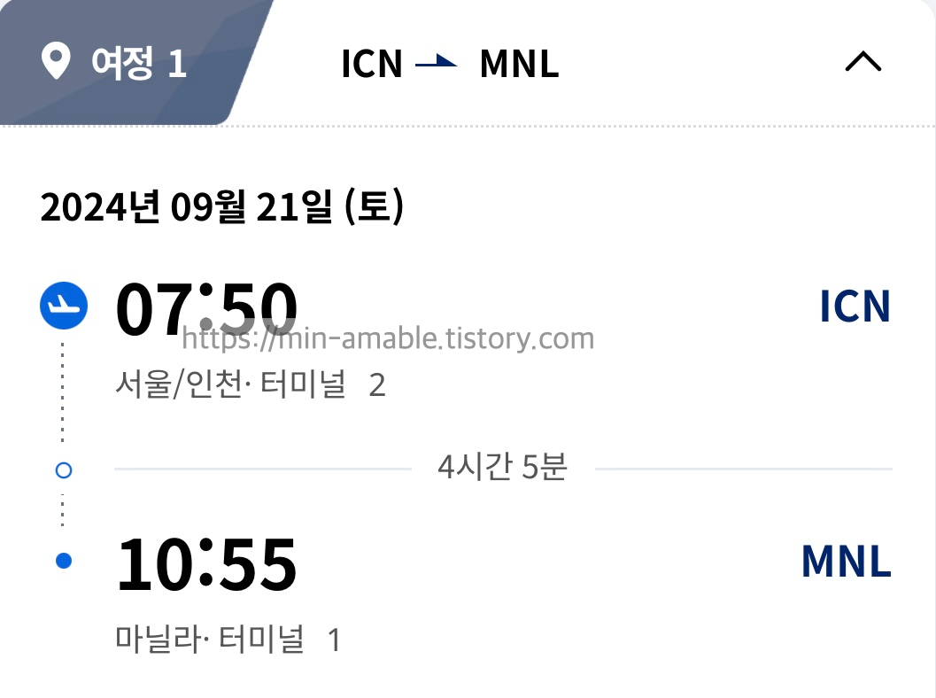 오전 7시 50분 KE621 편으로 인천에서 마닐라로 출국하는 날.