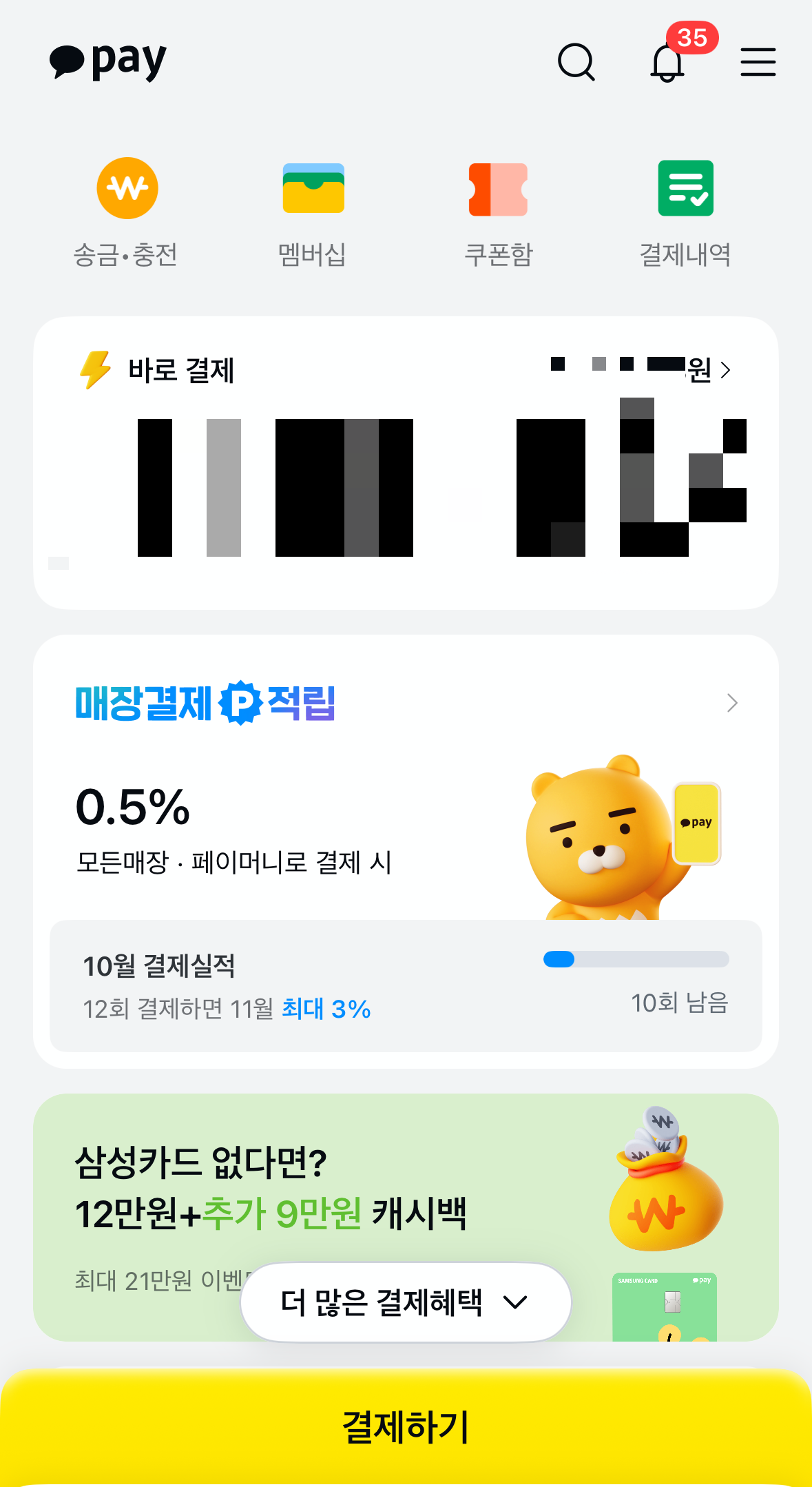 카카오페이 앱을 열고, 결제하기 버튼을 눌러보세요.