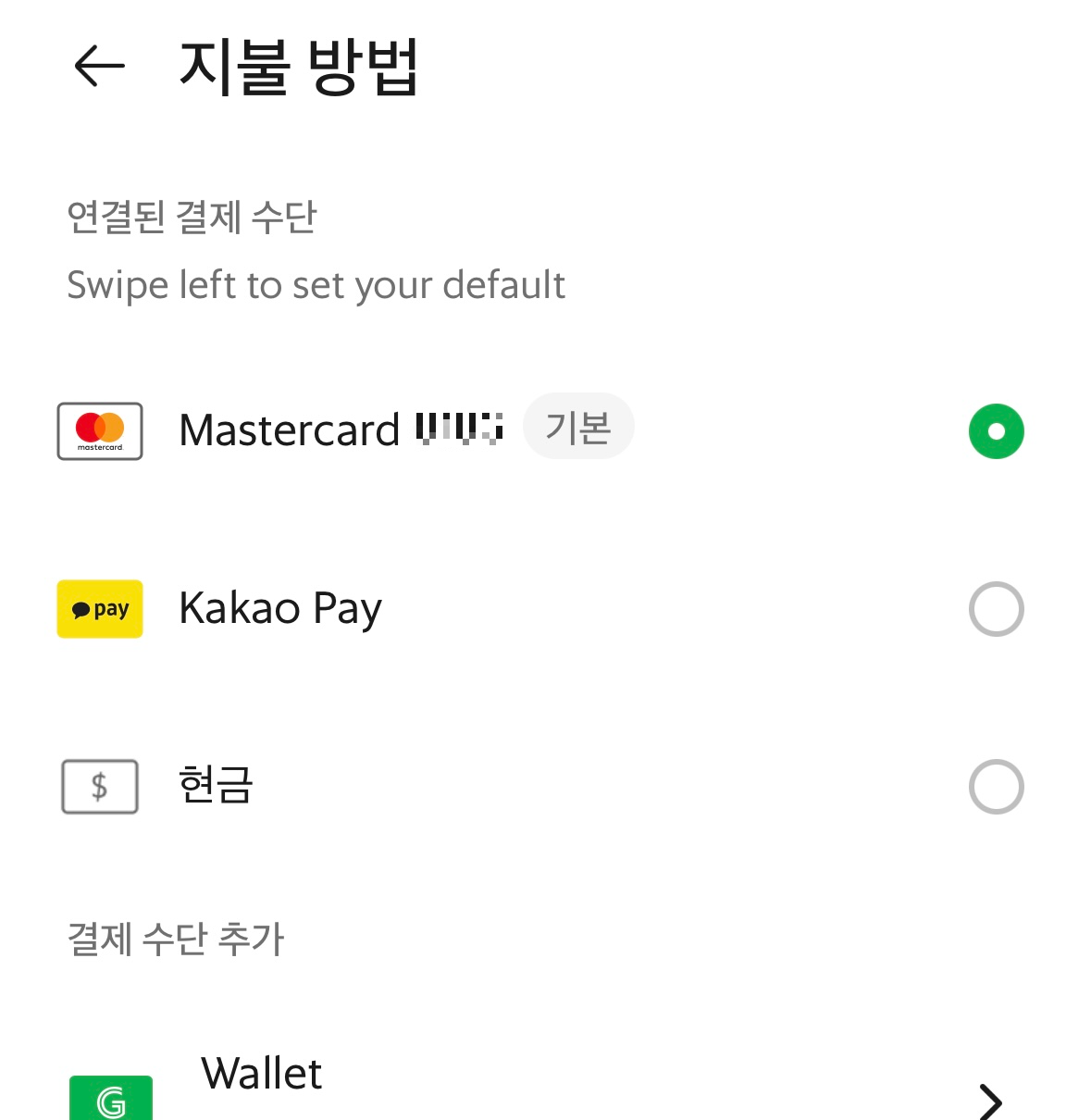 저는 신용카드를 기본으로 설정해 두고 현금으로 결제하고 싶을 때마다 바꿔서 결제했습니다.