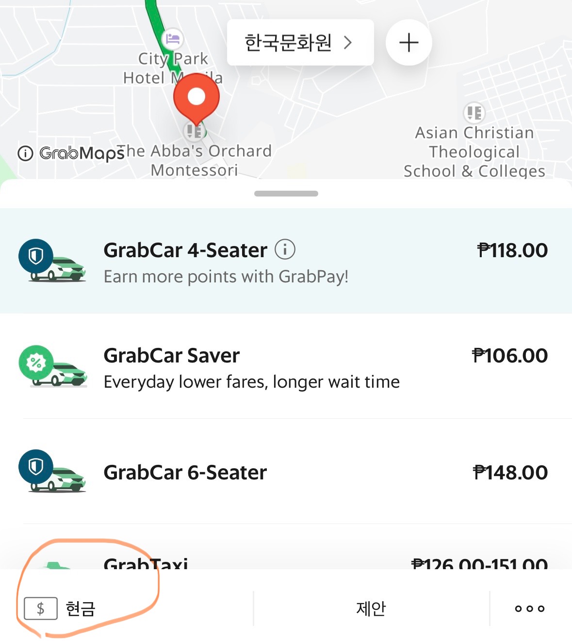 예상결제 금액에 딱 떨어지는 현금이 없으면, 결제 수단을 바꾼 다음에 다시 그랩을 찾으세요.