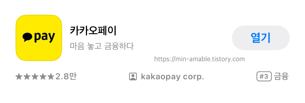 이미 내 휴대폰에 카카오페이가 설치되어 있으면, 앱스토어에서 '열기'라고 표기가 되어있습니다.