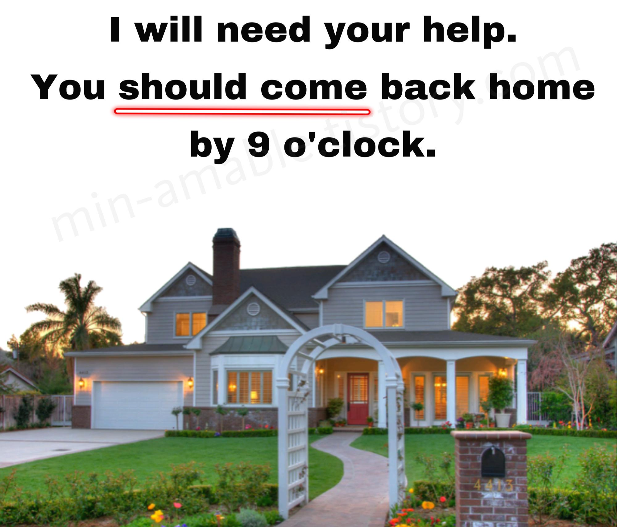: 나는 너의 도움이 필요할 거야. 9시까지 집으로 돌아와야 해.