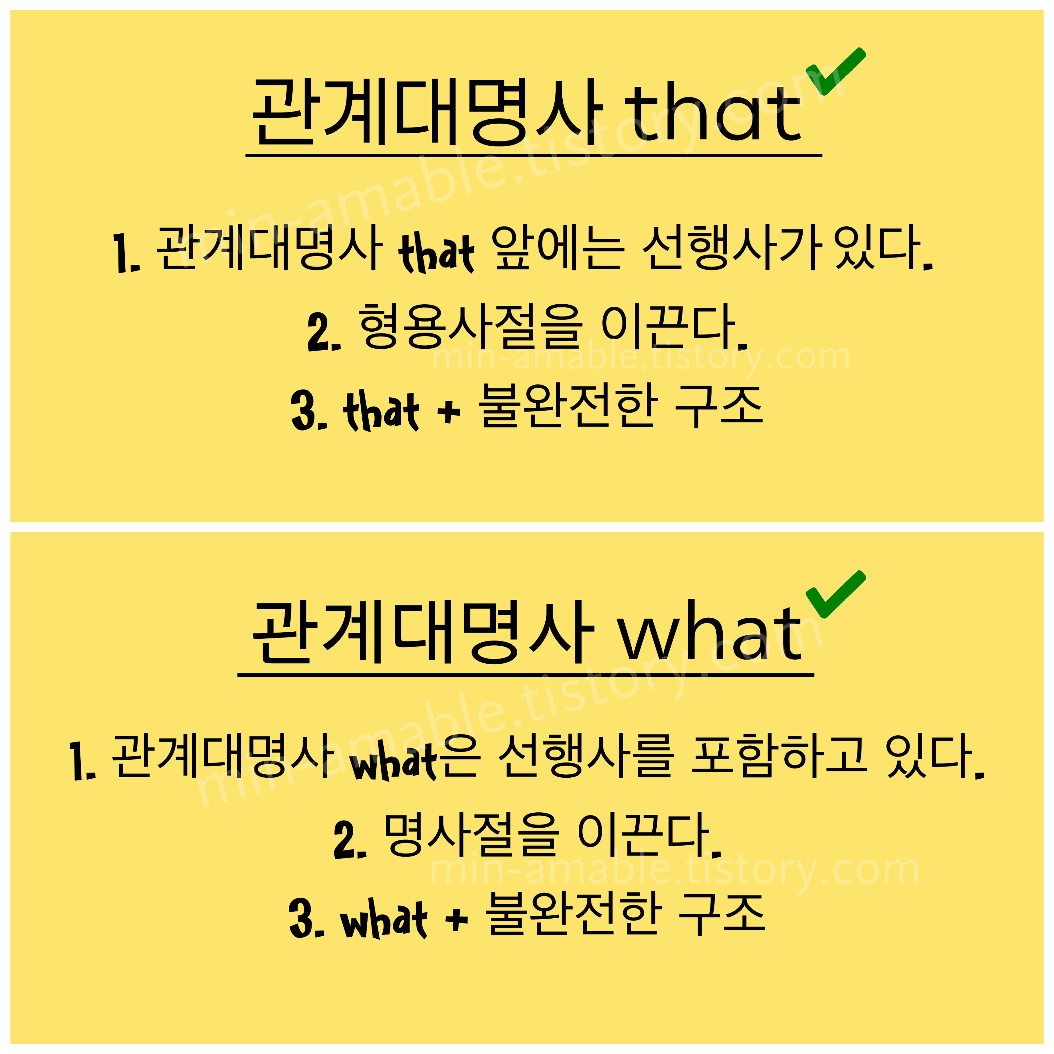 시험에 종종 출제되기 때문에 관계대명사 that, what 그리고 접속사 that의 각 쓰임을 올바르게 이해하는 것이 중요합니다. 명사절, 형용사절이 무엇인지도 자세히 설명해 놨으니 꼼꼼히 공부하도록 합시다!