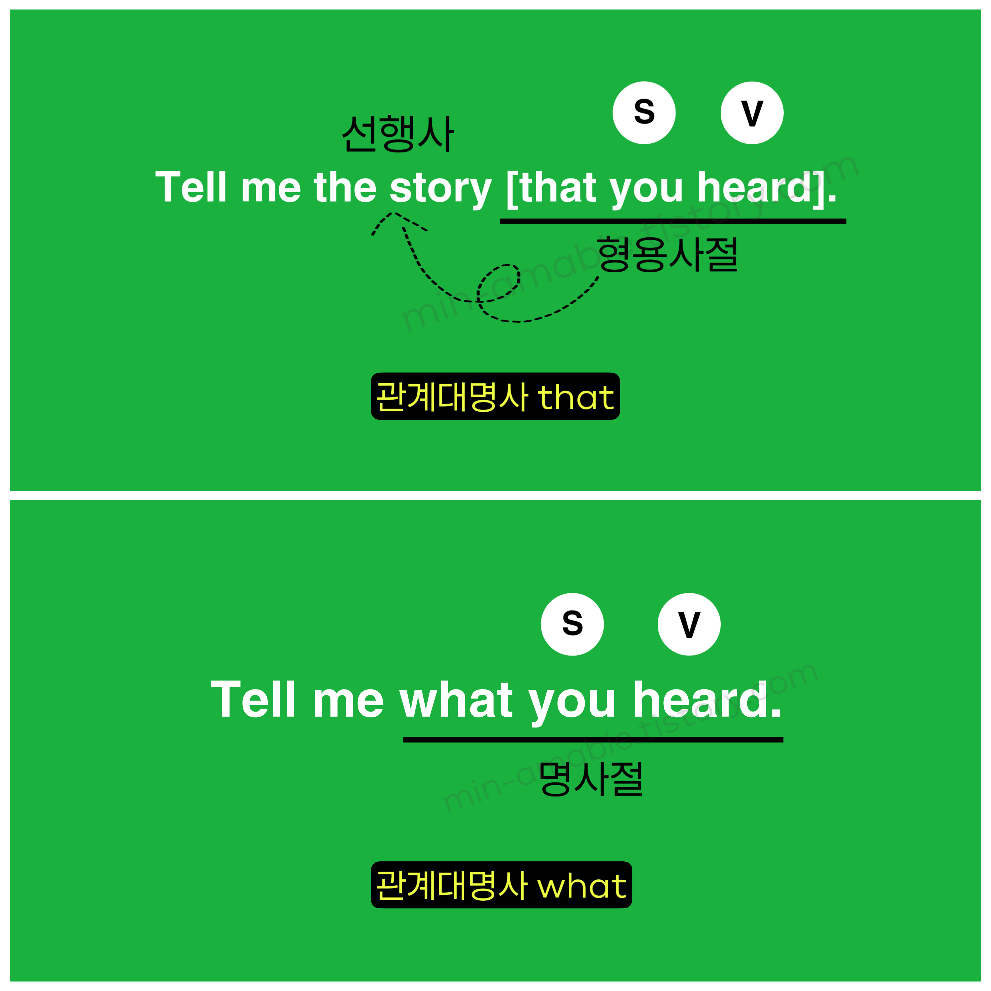 첫 번째 문장 Tell me the story [that you heard]에서, [that you heard] 가 the story를 수식하고 있죠? story의 품사는 명사 이므로 명사를 꾸며주고 있는 [that you heard]가 형용사 역할을 하고 있으며 주어(you) + 동사(heard)가 있기에 형용사절 이 되는 것입니다.